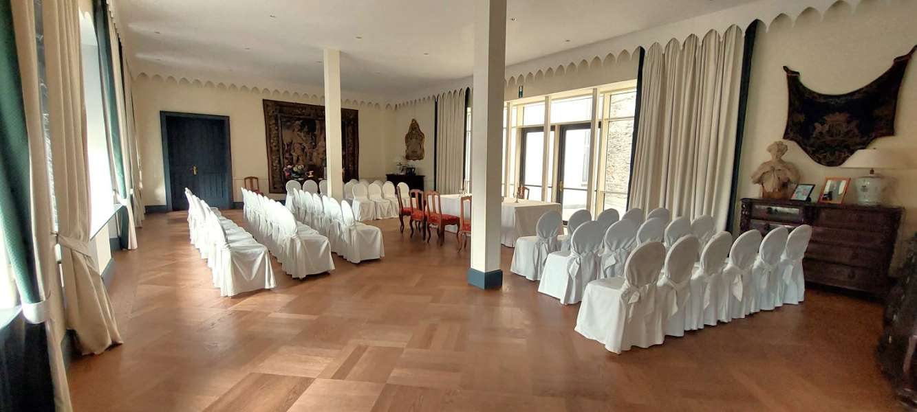 Gobelinsaal (2. OG): Ebenfalls hell und freundlich mit großem Wandteppich und breiten Fenstern – ideal für feierliche Zeremonien mit vielen Gästen.