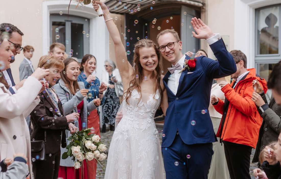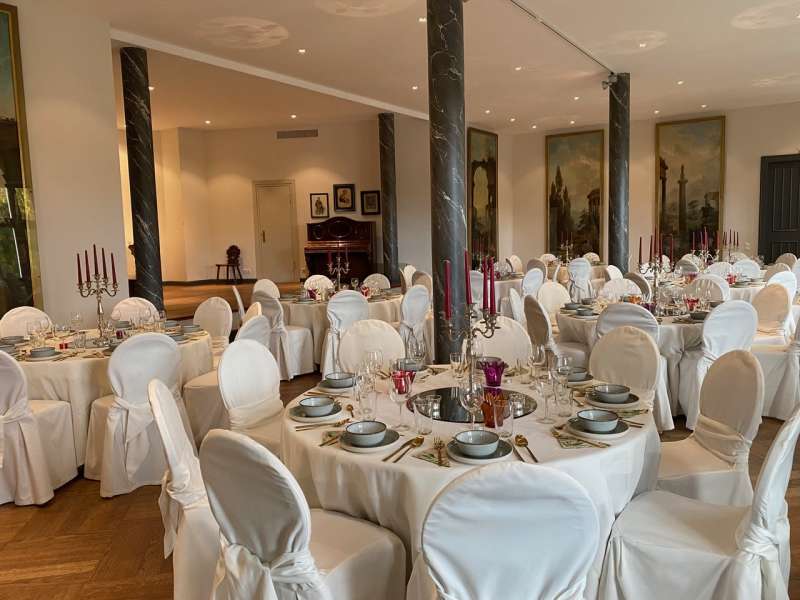 Für elegante Empfänge und festliche Feiern, wie Hochzeiten, Jubiläen oder Geburtstagsfeste, bietet sich der prachtvolle Festsaal an, der mit einem bezaubernden Gartensalon und einer großzügigen Freiterrasse verbunden ist. Nach der Trauung können Sie mit Ihren Gästen auf der Terrasse anstoßen und den atemberaubenden Blick auf den idyllischen Schlosspark genießen.