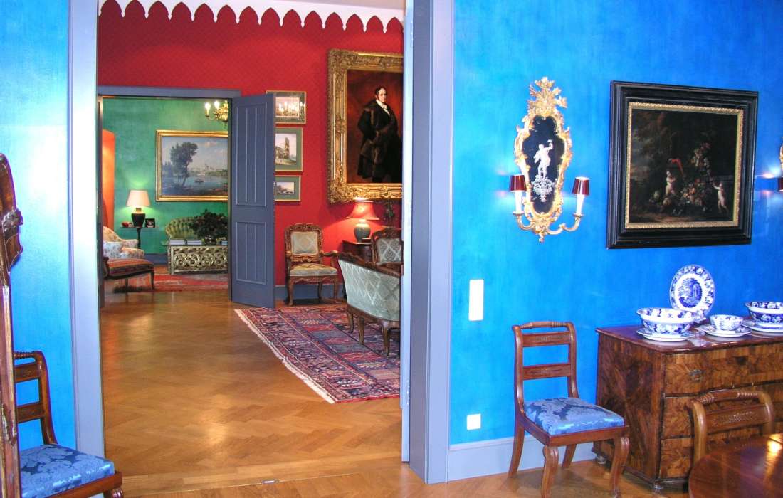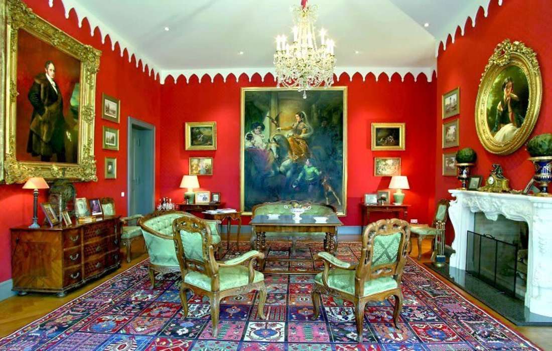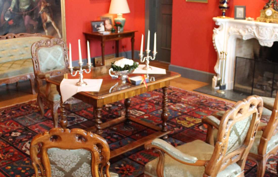 Roter Salon (2. OG): Der Rote Salon in den privaten Gemächern des Sayner Fürstenhauses eignet sich ideal für kleinere Gesellschaften (max. 25 Gäste). Er begeistert mit seiner wertvollen Ausstattung und drei besonderen Gemälden, die Fürstin Leonilla und Fürst Ludwig zu Sayn-Wittgenstein-Sayn zeigen – porträtiert von den besten Malern ihrer Zeit. Das Fürstenpaar ließ Schloss Sayn im 19. Jahrhundert zum neugotischen Residenzschloss umbauen.