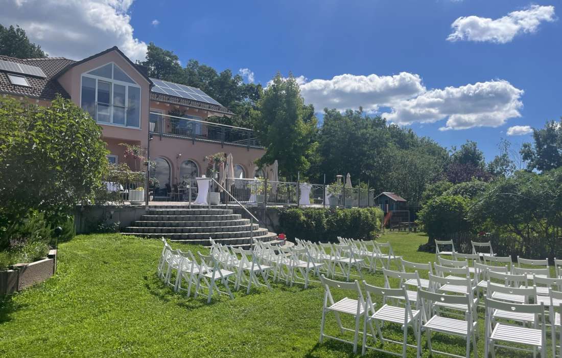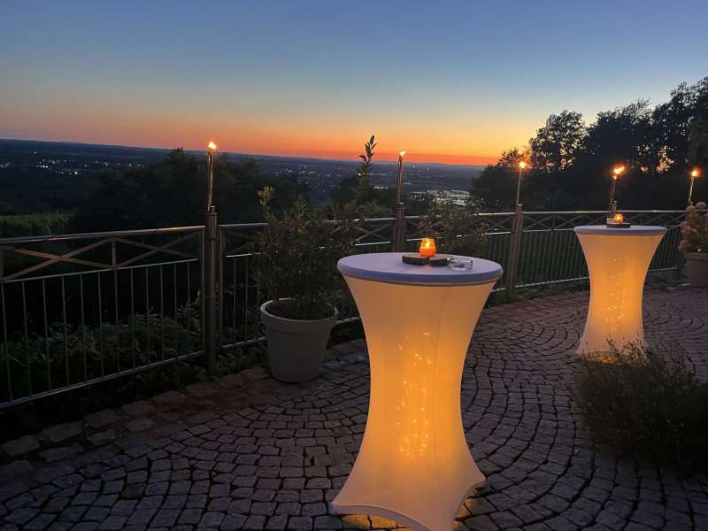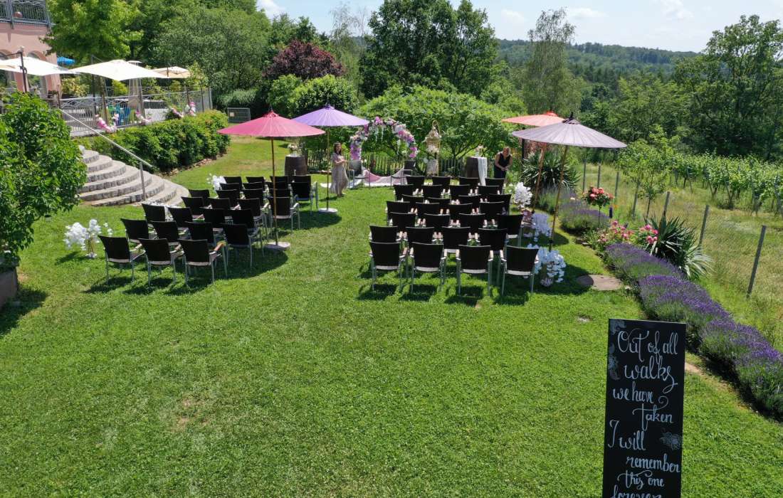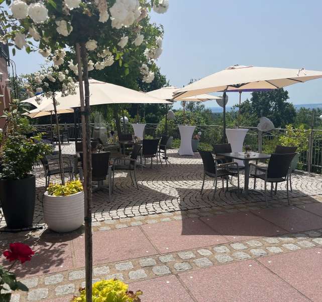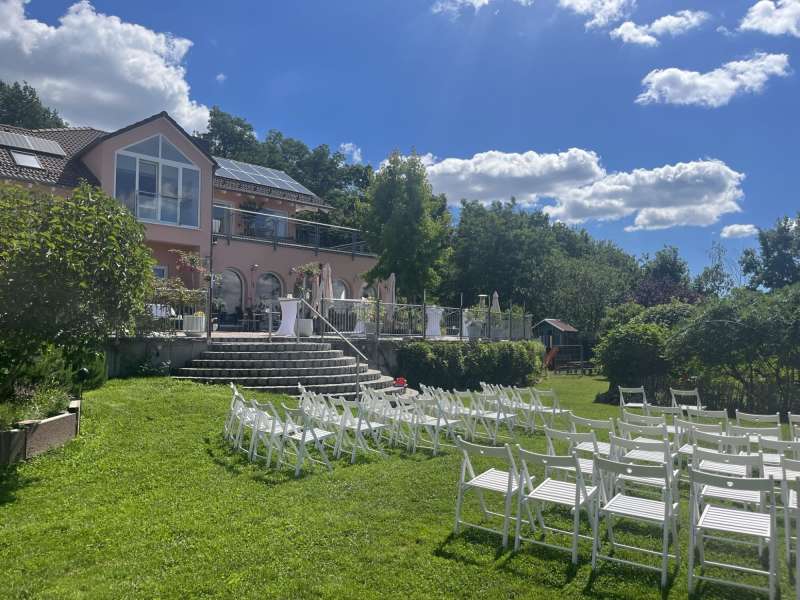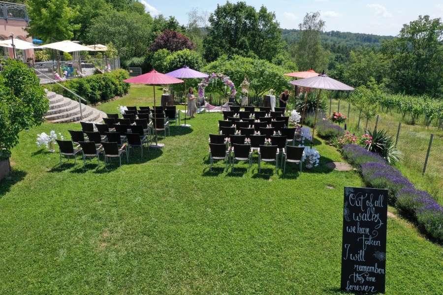 Das besondere an der Schönen Aussicht ist definitiv die Lage - hinten der direkte Zugang zum Wald, nach vorne der Blick auf die Weinberge und ins Tal bis zum Odenwald. Rundum umgeben von einen Meer aus Blumen und Pflanzen, die sofort ein Urlaubsfeeling vermitteln und eine Feier weit ab vom Alltäglichen ermöglicht.