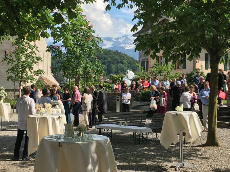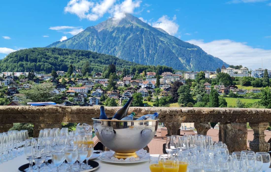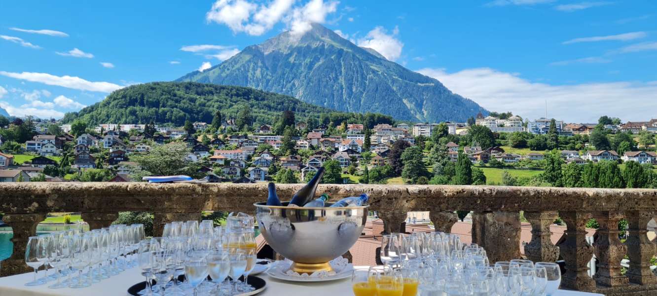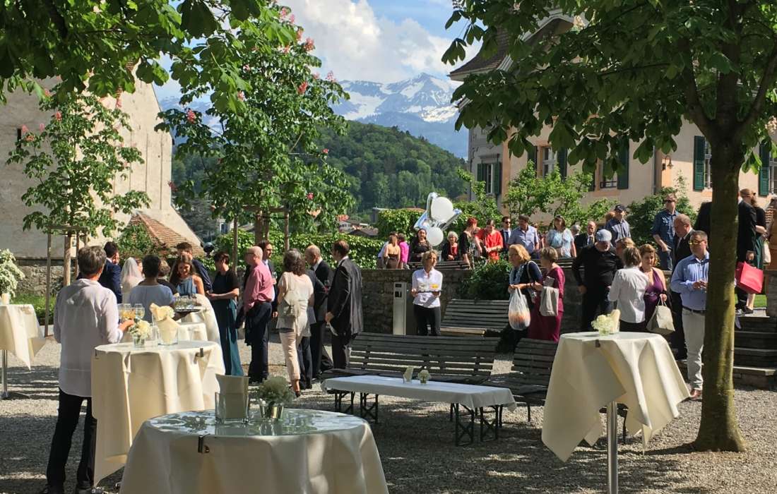 Der anschließende Apéro wird ganz nach Ihren Wünschen gestaltet – entweder im Schlosspark mit Blick auf den Thunersee oder in den stilvollen Schlossräumlichkeiten. Die Hochzeitsplanung rund um Trauung und Apéro ist bei uns inbegriffen und wird von einem erfahrenen Team begleitet, das auf langjährige Erfahrung zurückblickt.