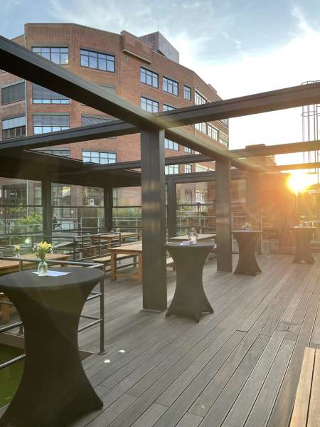 Die großzügige Terrasse direkt am Wasser ist ein Highlight für jede Hochzeit. Hier lassen sich freie Trauungen, Sektempfänge oder spätere Chill-out-Momente unter freiem Himmel erleben – mit Blick auf die beleuchtete Architektur Düsseldorfs.