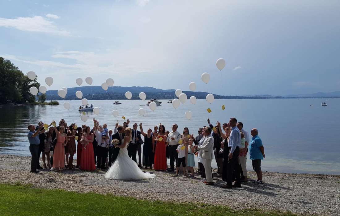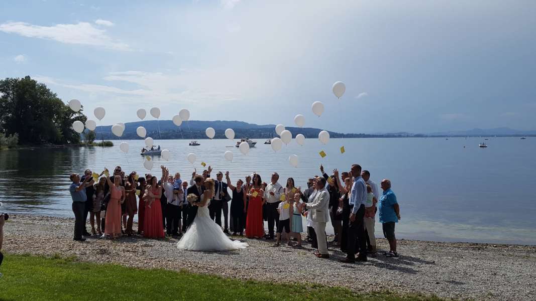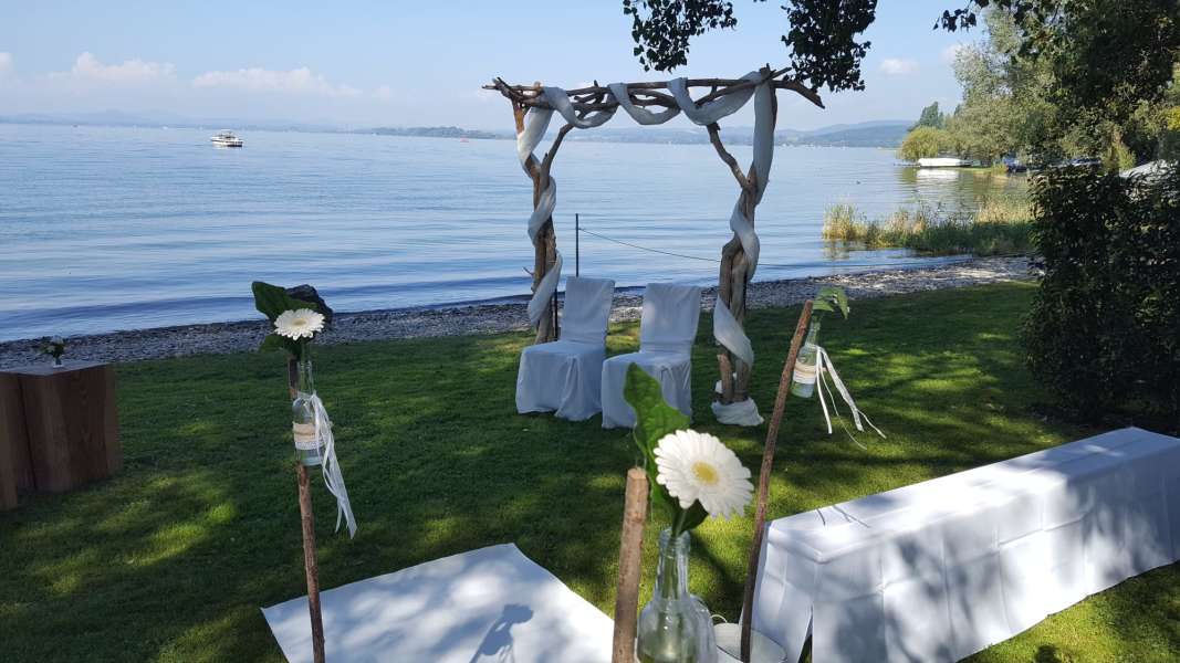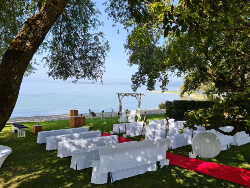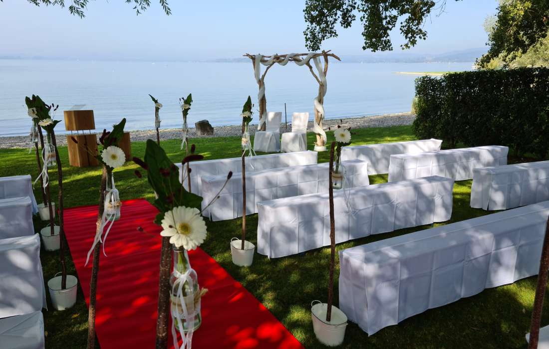Im zauberhaften Ambiente und am direkten Ufer des Bodensees stellen wir Ihnen die komplette Infrastruktur für Ihre Trauzeremonie. Ein Traubogen, weiße Bänke mit Hussen, ein weißer/roter Teppich und festliche Dekoration wie Weinfässer, Holzherzen, Lampions usw. verzaubern den Strand in eine märchenhafte Traulocation.