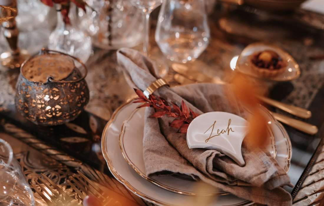 Fertig eingedeckt mit goldenen Tellern, Tischdecken, Besteck und Gläsern.