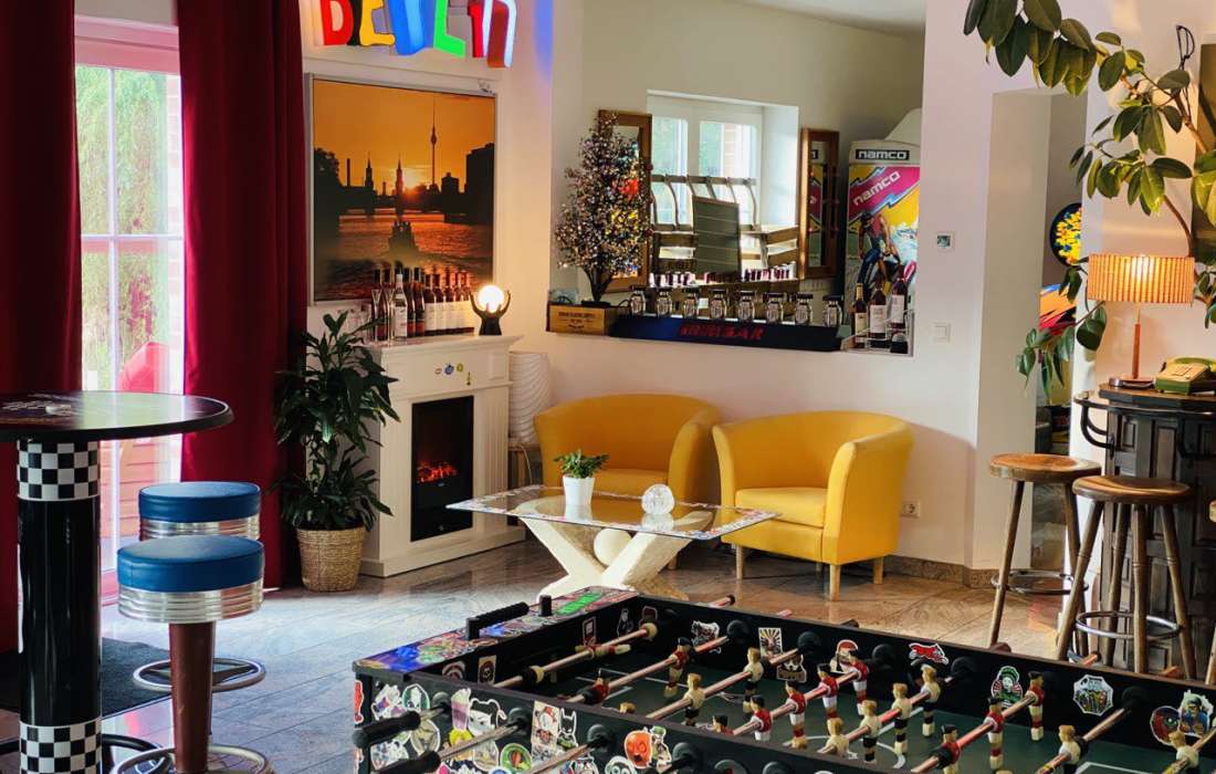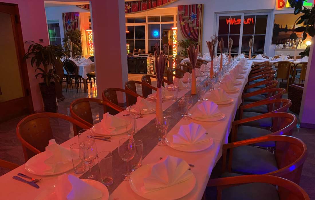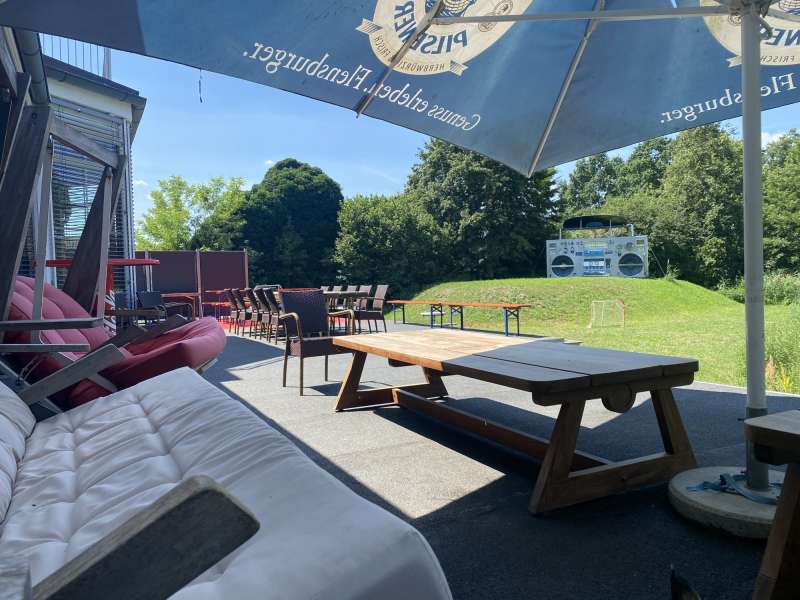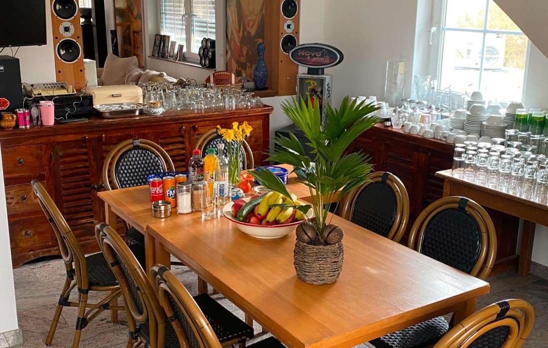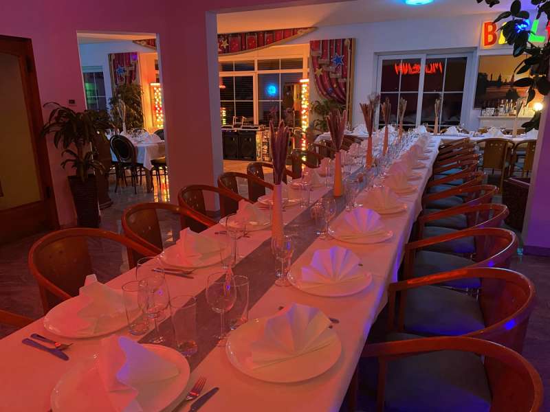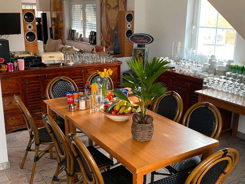 Die angebotenen Räume sind wie auf den Bildern zu sehen komplett eingerichtet und verfügen über eine umfangreiche Ausstattung wie Musikanlage, Lichtanlage, Kühlgeräte, Grill, Bier-Zapfanlage, Konvektomat, Eiswürfelmaschine, Geschirr, Gläser, Besteck umfangreiche Küchenausstattung, Kaffeevollautomat usw.