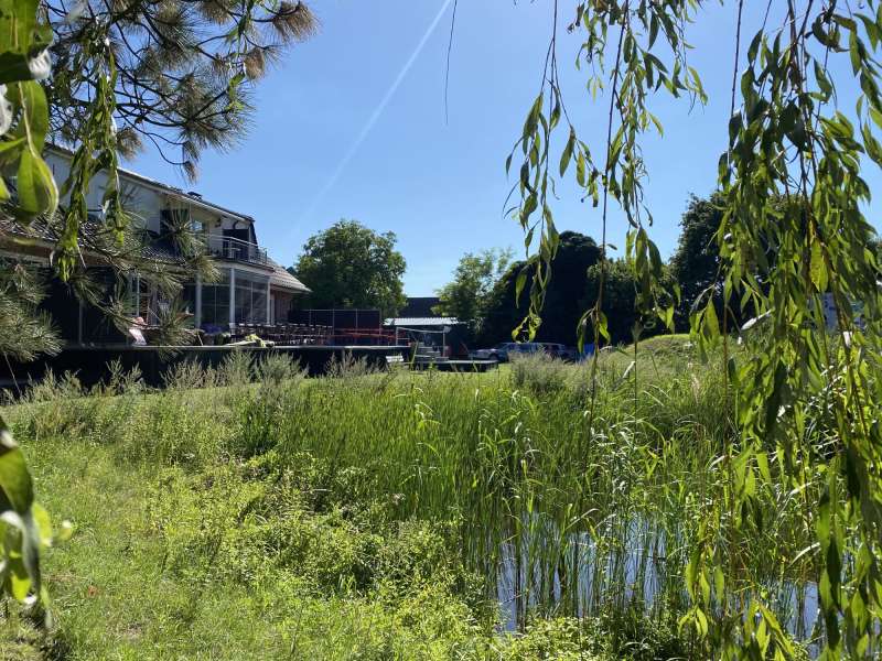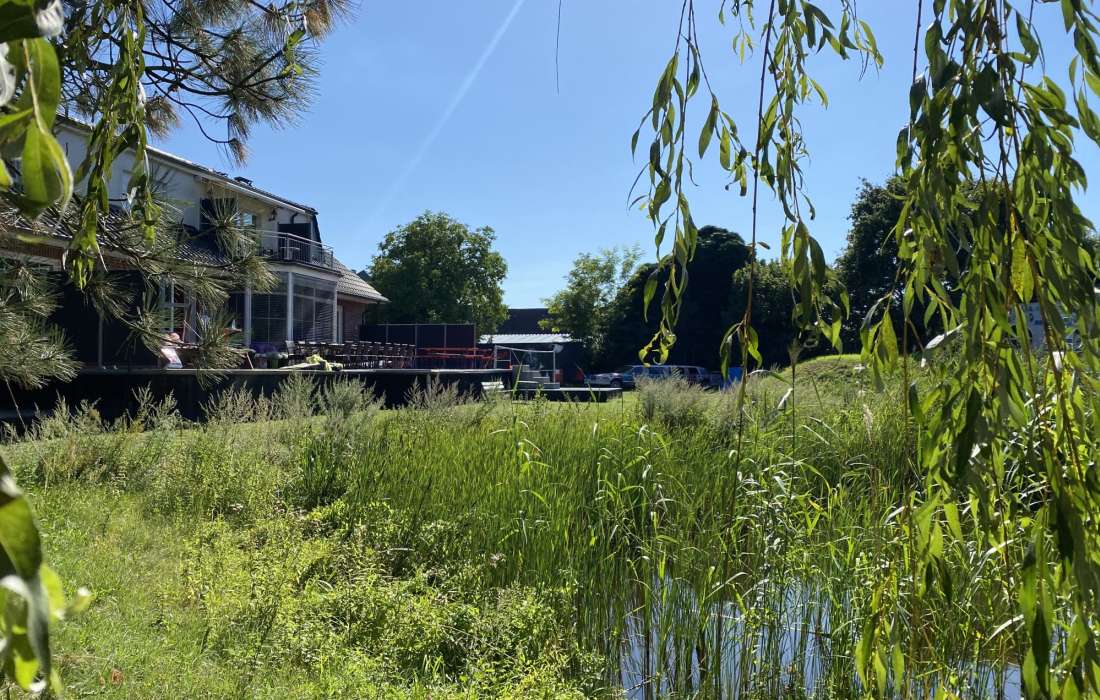 Am hinteren Teil der Villa befindet sich eine Terrasse mit direktem Blick auf den anliegenden Privatsee mit kleiner Insel. Der See liegt inmitten eines vielfältigen Biotops.