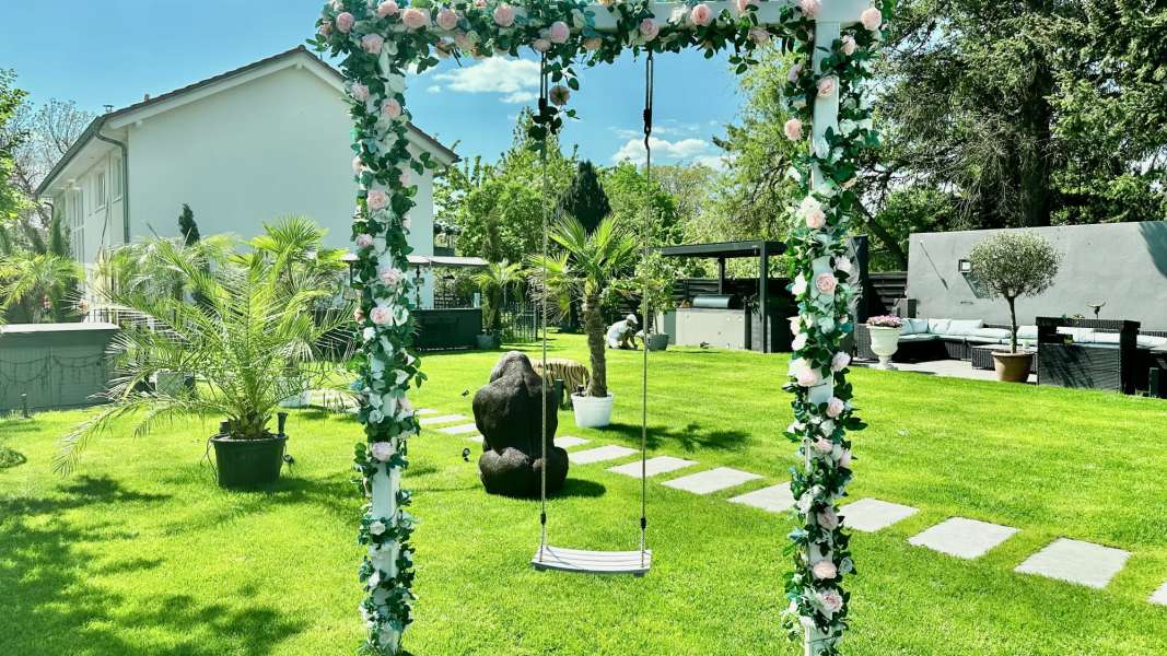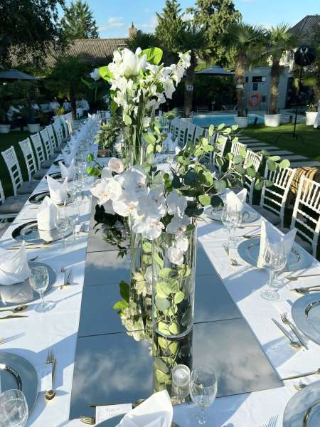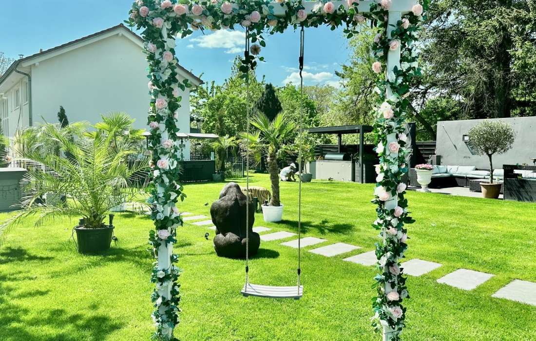 Unsere Hochzeitslocation bietet Ihnen und Ihren Gästen ein unvergleichliches Erlebnis in einem tropischen Garten, der mit zahlreichen mediterranen Pflanzen wie Palmen, Oleander, Oliven- und Zitrusbäumen mit Früchten geschmückt ist. Das Highlight unserer Anlage ist der große Salzpool, der eine perfekte Kulisse für unvergessliche Momente schafft.
