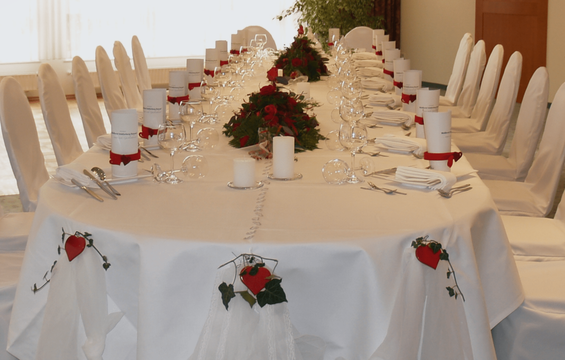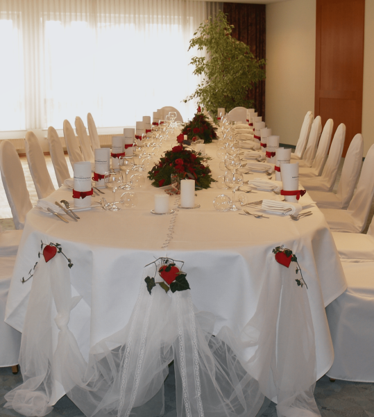 Die 15 Veranstaltungsräume bieten Hochzeitsfeiern mit bis zu 150 Personen einen idealen Rahmen. Alle Räume können ganz nach Ihren Wünschen vorbereitet werden. An Tischdecken und Servietten stehen Ihnen verschiedene Farbtöne sowie jeweils farblich passende Kerzen zur Verfügung. Gerne übernimmt das Hotelteam auch das Schreiben Ihrer Menükarten, die Besorgung der Blumenarrangements sowie des Kuchens.