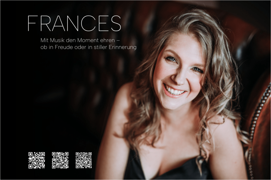 wie schön, dass ihr da seid! Ich bin Frances, Sängerin aus Essen, und es freut mich von Herzen, dass ihr euch für meine Musik interessiert. Musik ist für mich etwas Wunderbares – sie verleiht jedem Anlass Tiefe und bleibt im Herzen. Es wäre mir eine große Ehre, euren besonderen Tag – sei es eine Hochzeit, Taufe oder ein Abschied – mit meiner Stimme zu begleiten.