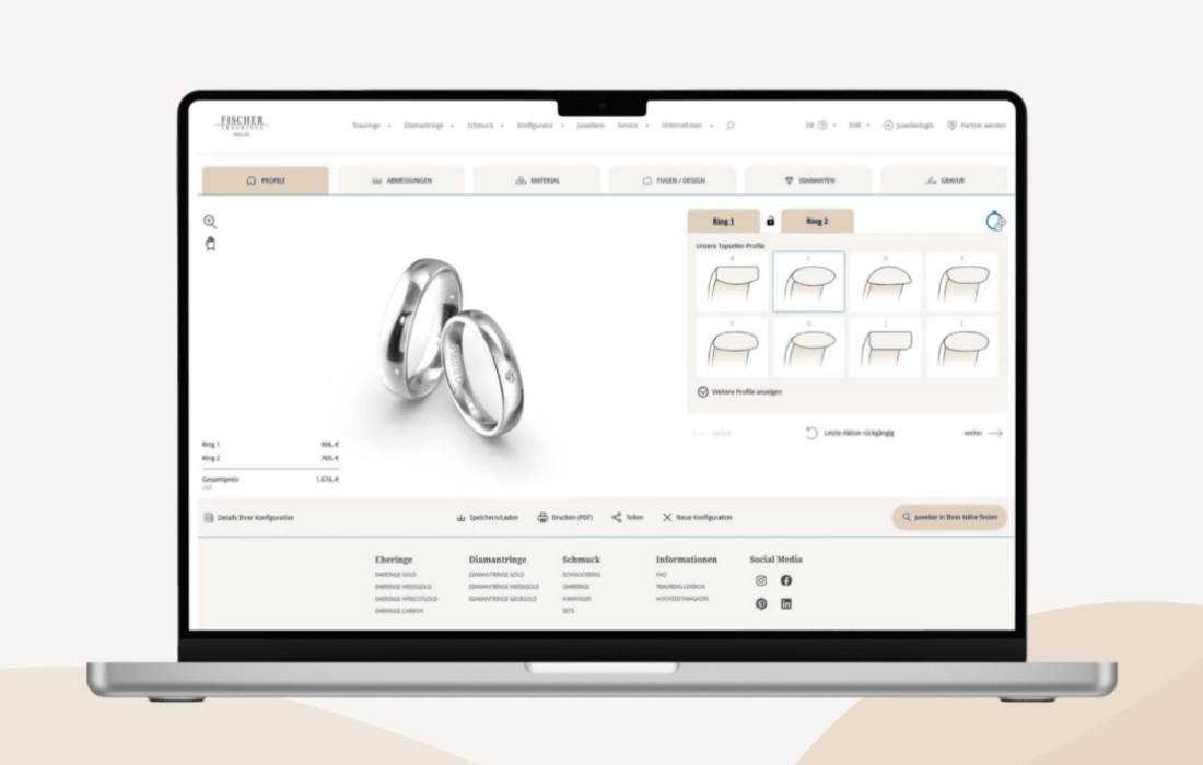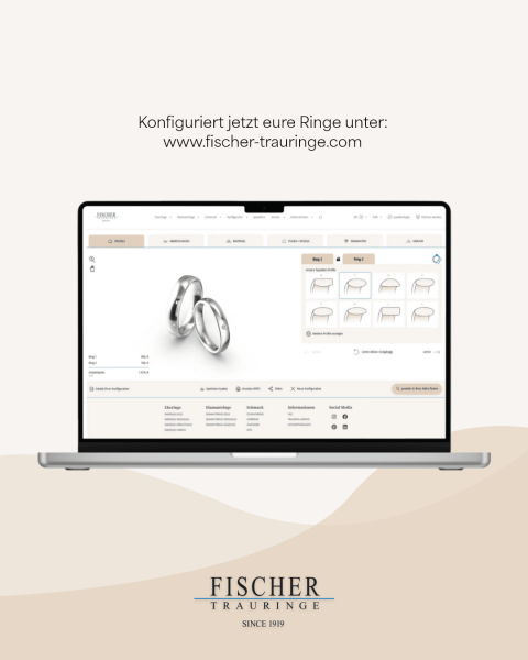 Fischer vereint Tradition und Innovation. Neben klassischen Designs entstehen Kollektionen in außergewöhnlichen Legierungen wie Caramel- oder Apricotgold, in Kombinationen aus Carbon oder mit spannenden Oberflächenstrukturen. Jedes Paar hat die Möglichkeit, seine Trauringe ganz nach Wunsch zu gestalten, ob im Juweliergeschäft oder online mit unserem „Konfischerator“.