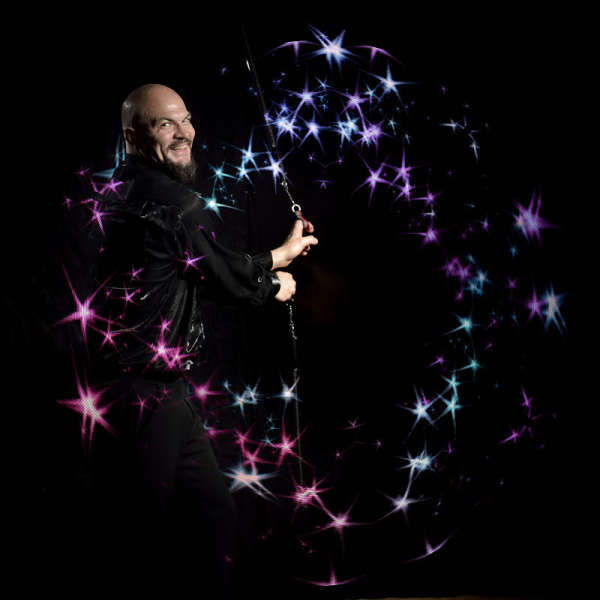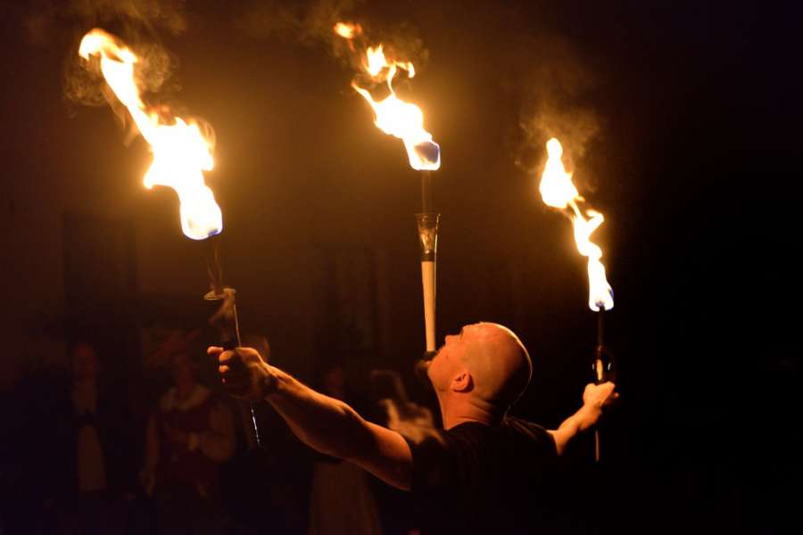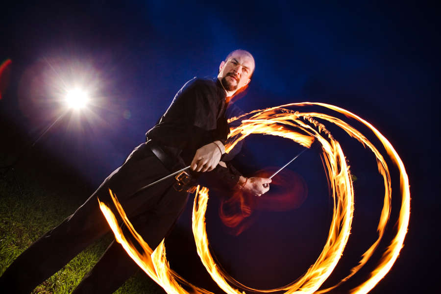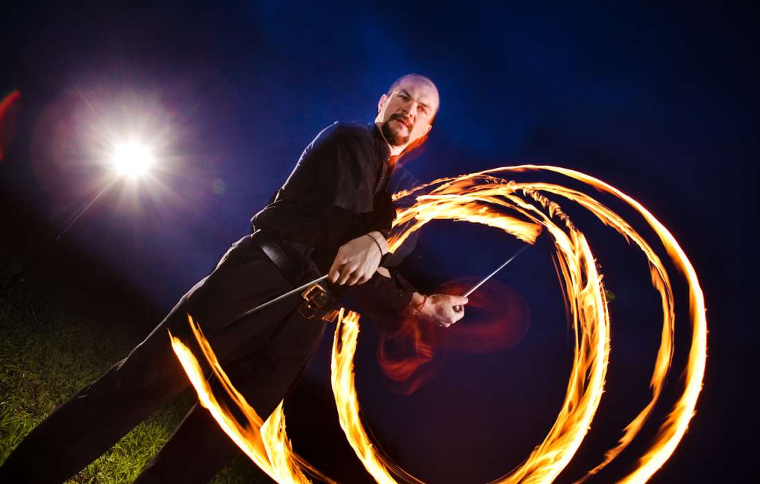 Es kommen verschiedene Requisiten zum Einsatz: Feuerseil, -springseil, Jonglierfackeln geschwungen und jongliert. Je nach Möglichkeiten vor Ort und Wetterbedingungen kommen sogar große Stichflammen und Funkeneffekte zum Einsatz. Dabei ist mir die Sicherheit für alle Beteiligten sehr wichtig!