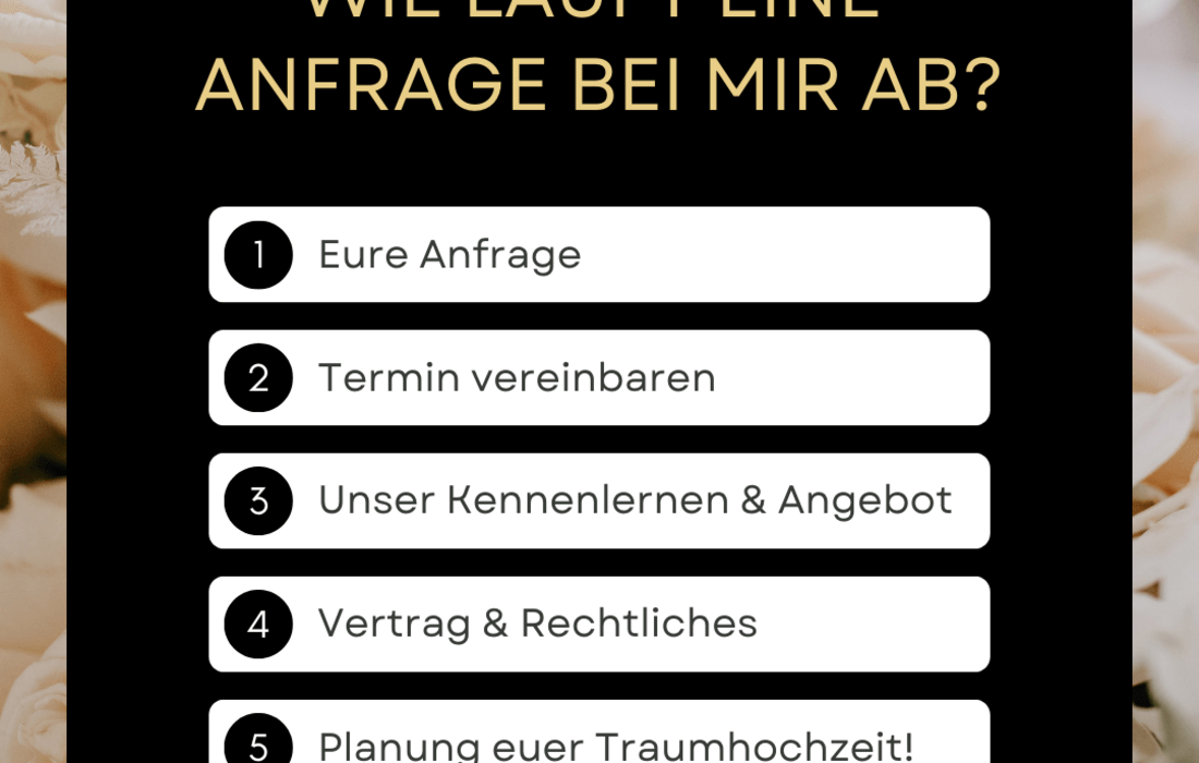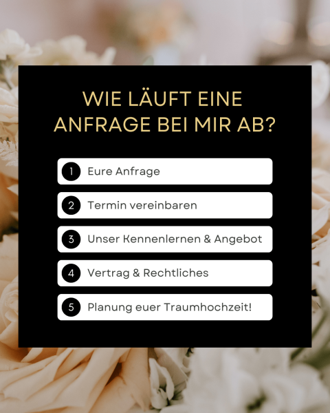 Nimm noch heute Kontakt mit mir auf, um ein unverbindliches Angebot für die Planung deiner Hochzeit oder Veranstaltung zu erhalten. Ich freue mich darauf, dich kennenzulernen und deinen besonderen Tag unvergesslich zu machen!